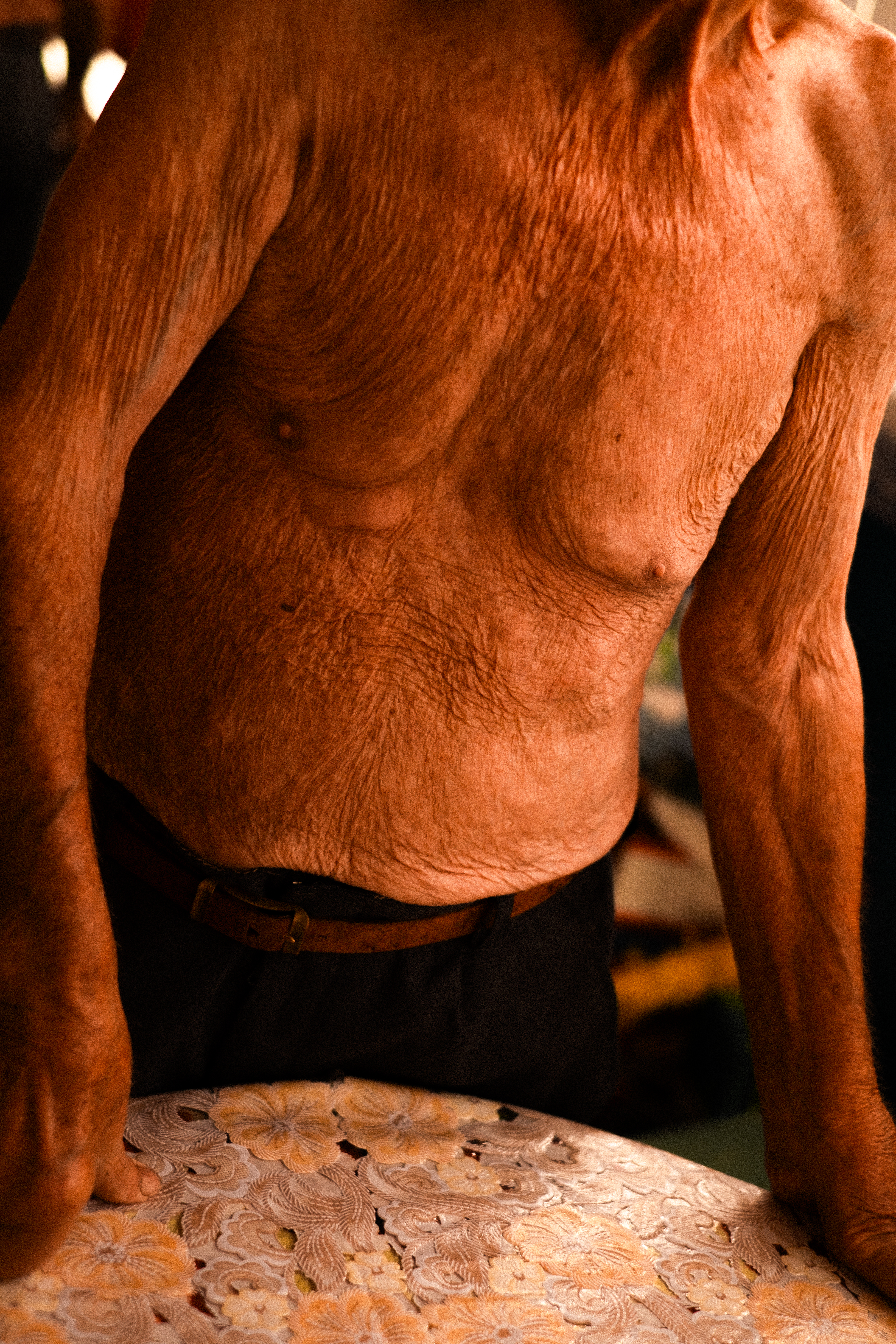 My work explores how photography can function as both archive and emotional landscape, a space where memory, tenderness, and transformation coexist. The images are not linear narratives but fragments: sunlight on my son’s legs, lightning cutting through the sky, fruit resting on my father’s aging body. These recurring moments form a meditation on caregiving and continuity.
